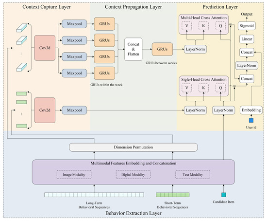 Specifically, TLSR first divides the user’s historical behavior sequence into long-term and short-term behavior sequences in the behavior extraction layer, integrating the multimodal information of items to achieve early fusion. Next, it leverages the context capture layer and context propagation layer to model long- and short-term preferences, achieving intermediate fusion and integrating personalized contextual states within preferences. Then, the prediction layer utilizes cross-attention mechanisms to interact with candidate items. By progressively incorporating user features, it predicts the purchase probability of each candidate item under the current context.