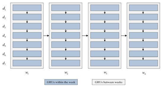 Step 2: After the intra-week recurrence, the four fused features are concatenated and flattened according to the weekly time sequence. Then, another GRUs is used to perform the inter-week recurrence calculation, as follows.