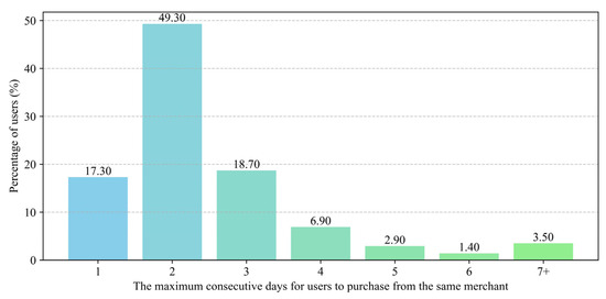 The heatmap in Figure 4 represents the percentage of users purchasing takeout food each day, and this heat distribution visually demonstrates the time periodicity of purchasing preferences. Specifically, users tend to purchase more takeout food near the weekends. On the other hand, Figure 5 illustrates the distribution of the maximum consecutive days for users to purchase from the same merchant, showcasing the continuity of their purchasing preferences. In other words, most users purchase takeout food from the same merchant for no more than three consecutive days.
