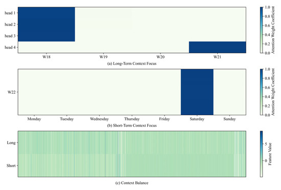 Regarding food ID = 16901 for case 3 shown in Figure A3, in the long-term context, it focuses more on the features centered around “W18” and “W21” after local convolution. In the short-term context, it focuses more on the features of the current week (W22) that have undergone local convolution with “Thursday” as the core. This also indicates a high correlation between food ID = 16901 and these features.
