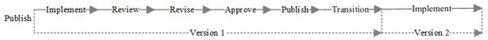 From a lifecycle perspective, the standardization process goes through several stages, from the introduction of an idea to the publication of the standard. These stages are listed as follows: proposal stage, preparatory stage, committee stage, draft stage (enquiry stage), approval stage, and publication stage. Throughout the standard implementation process, a “review stage” is carried out to check whether the standard is being implemented effectively and, if necessary, to revise it. Then, a new version of the standard is created and submitted to a new approval and publication stage. SDO controls versions with the publication year and after the transition stage, the standard with the “latest version” at time t, , as shown in Figure 1.