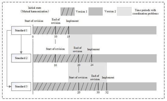 (4) Each standard’s state is defined by its version number at time . Coordination between standards is assumed when their version numbers align. Secondary revisions of the same standard are excluded from consideration.