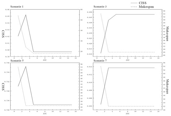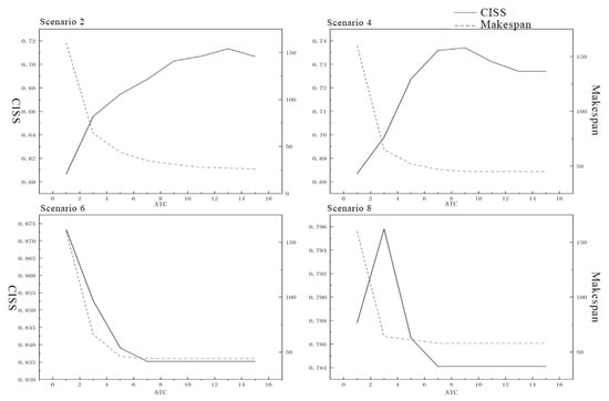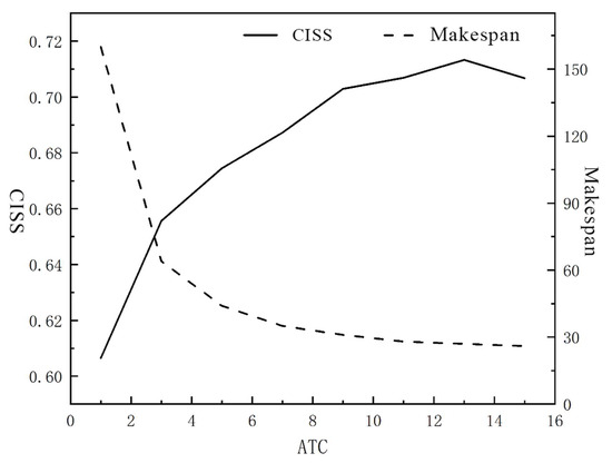 The TC standard revision capacity () is an important parameter in standardization governance. In practice, TC secretariats are often attached to specialized institutions. For instance, the secretariat of TC544 is jointly hosted by the China Satellite Navigation Engineering Center and the China Aerospace Standardization Institute. The number of standard revision projects a secretariat can undertake concurrently varies based on its project management capacity. In the traditional RCPSP, an increase in the number of resources is often effective in improving the makespan. As TC staff are mostly part-time, insufficient standards revision capacity influences the systematic effect of the standards in this field, while excessive standards revision capacity leads to resource inefficiencies. The following experiments analyze the and the makespan of the standard revision project under different levels. Using the example in 5.1, the following experiment analyzed the standard revision project and total completion time at different levels. Taking the example in Section 5.1, the is set at 1, 3, 5, 7, 9, 11, 13, 15, and the optimal value obtained through iteration of the standard revision plan and its corresponding construction period is calculated for each condition. The results are shown in Figure 7.