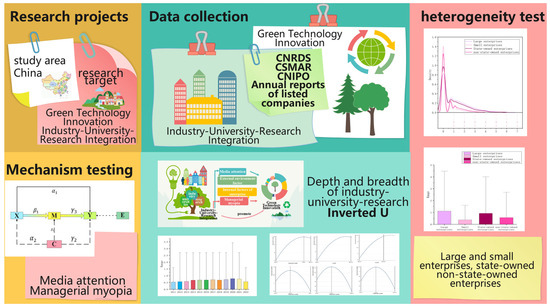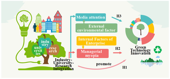 In the context of global industrialization, several environmental issues, including severe weather and ecological environment degradation, not only threaten the ecological balance of nature but also adversely affect the political economy and other aspects of human society, which forces countries worldwide to acknowledge and defend the challenges brought about by environmental problems [1]. As traditional technologies and methods have been unable to solve these problems effectively [2], advanced green technologies have increasingly emerged as a crucial method for addressing environmental issues and fostering sustainable development. Their importance has become increasingly prominent. In recent years, China has prioritized green technology innovation (GTI), and the 19th CPC National Congress report explicitly stated the task requirements for building a market-oriented GTI system. The 20th CPC National Congress report outlined plans to enhance the ability of GTI and accelerate the development and spread of innovative, energy-efficient, and carbon-reduction technologies. The Third Plenary Session report of the 20th Party Central Committee emphasized supporting the manufacturing sector’s upscale, wise, and environmentally friendly growth and supporting enterprises to use digital intelligence technology and green technology to transform and upgrade traditional industries. GTI considers economic and environmental benefits and emphasizes technological breakthroughs [3]; it can drastically cut carbon emissions in the area [4,5], reduce resource consumption and environmental pollution, improve energy efficiency [6], and is the cornerstone of economic growth [7]. However, promoting GTI more effectively remains a complex problem. Currently, GTI faces many challenges, including an imperfect management system, a shortage of financial resources [8], imperfect market development [9], and the linkage bottleneck in the coordination mechanism. These problems not only limit the development speed and technical depth of GTI but also require that the promotion of GTI crosses a higher threshold and has a more substantial research and development capability [10]. In this complex situation, it is difficult for a single entity to cope with the difficulties and challenges of GTI [11], and multiple participants must cooperate to solve the problem. Therefore, enterprises expect to solve these challenges through the active policy support of the government and the technical assistance provided by scientific research institutions and universities. Strengthening the integration of IUR has become crucial for encouraging the expansion of businesses’ GTI, and the research on the integration of IUR has a significant impact on GTI.