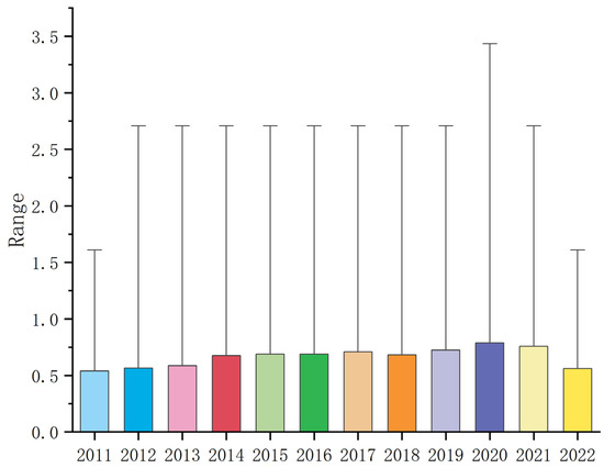 There are many measurement methods for GTI. Based on the reference of previous empirical articles, this paper takes the number of green patent (GP) applications as the proxy variable of GTI concerning the research on GTI [77]. The total number of GP applications, the total number of patent applications for green inventions, and the number of green utility model patent applications were taken as the dependent variables, and a logarithm of 1 was added to measure the GTI levels of enterprises. To show enterprises’ GTI levels more intuitively, we drew the data graph of the Ln (1 + total number of GP applications) year distribution, as shown in Figure 3.