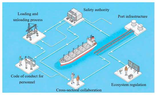 As a core link in the energy supply chain, oil tanker loading and unloading operations constitutes a complex open system involving the coupling of technology, management, and society, from port infrastructure, loading/unloading procedures, safety regulation, cross-departmental collaboration, personnel behaviour standardisation, and ecological environment supervision, forming a multi-level, interactive spatial network system (see Figure 1). The safety risks of these operations are not only determined by single dimensions, such as equipment reliability or operational standardisation, but also necessitate systematic control within a collaborative framework that balances physical constraints, procedural coordination, and human relationship equilibrium.