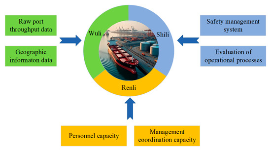 The Wuli–Shili–Renli (WSR) theory, first proposed by Professor Gu Jifa in 1994, is a complexity science methodology developed from Eastern systems thinking [20]. This theory draws on Western systematic methodology and has been modified based on classical Eastern philosophy and Eastern systematic methodology. It analyses complex problems through three dimensions: Wuli, Shili, and Renli [21]. The WSR methodology differs from other studies that focus on single factors such as ship factors, human factors, and equipment factors. Among them, the “Wuli” dimension refers to the natural laws of the objective material world, as well as objective conditions such as the environment and historical development level; the “Shili” dimension refers to the mechanism and process optimisation of system operation, solving the problem of “how to do it”; the “Renli” dimension can deal with soft factors such as human behavioural psychology and social organisation. The dynamic coupling of the three factors affects the overall risk level, making it significantly enhance the effectiveness of risk prevention and control in multi-scenario risk management practices [22].