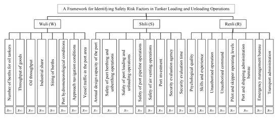 Figure 4 presents the framework diagram for the safety risk assessment of oil tanker loading and unloading operations, based on the WSR systems methodology. Drawing on the methods of Husak [30] and Liu et al. [7], this framework identifies 24 main influencing indicators from the perspectives of physics (Wuli), mechanics (Shili), and human relations (Renli). These indicators form the theoretical framework of safety risk factors for these operations.