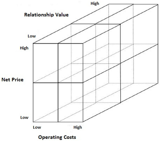 At present, most businesses typically use software or applications to manage their in-house processes, especially for time savings and human error elimination. In the context of customer segmentation activities, it is also possible to use modern software tools, for example, when categorizing information about customers or looking for closer links in this information [40,41,42,43,44,45]. Given the amount of data available to businesses on their customers, it is advisable not to limit themselves to one segmentation criterion in the segmentation process. There have been several customer segmentation models in the related literature, and these models often consider customer value, especially customer lifetime value. They can be classified into two groups: past customer behavior models (variants of RFM Model, RE-RFME, LRFM, PCV Model, SOW Model, etc.), and future-past customer behavior models, which take the future behavior of customers into consideration [40,45,46]. A very good overview of models and methods for segmentation can also be found in the work [47]. The model created by Turnbull and Zolkiewski, experts in marketing and management from the Manchester Business School, also appears in the literature. Their model lies in creating a three-dimensional matrix of customer classification [48,49]. The result is then a 3D segmentation model that classifies customers into eight quadrants (see Figure 1). To address this critical limitation and fill the identified research gap, this study introduces an advanced 3D segmentation model explicitly designed to align with the three pillars of sustainable development. A key advancement of our approach is the replacement or supplementation of Turnbull and Zolkiewski’s original criteria (relationship value, net price, and operating costs) with the criteria specifically selected to directly reflect the content of the three pillars of sustainable development. This innovative re-conceptualization provides a novel and comprehensive framework for sustainability-oriented customer management, particularly relevant for regulated sectors where a broader societal impact is expected.