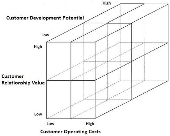 A modified three-dimensional customer classification matrix will be applied in order to create a 3D segmentation model for corporate customers. Within the model, three segmentation criteria reflecting the content definition of the three pillars of sustainable development will be respected, namely, the Customer Development Potential, Customer Operating Costs (Cost-to-serve), and Customer Relationship Value (see Figure 3).