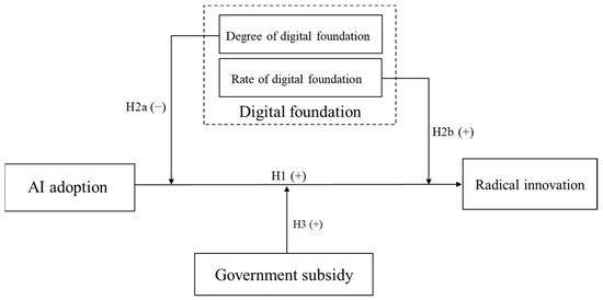 Beyond internal organizational factors, the external institutional environment also profoundly influences the process of AI-enabled radical innovation. Among these external factors, government subsidies stand out as a crucial policy tool whose role warrants particular attention [19,20]. In the realm of radical innovation, while the integration of AI injects new momentum into firms’ radical innovation efforts, it also introduces new challenges such as technological path uncertainty, algorithmic inexplicability, and systemic integration complexity [21,22]. In this context, external resource support becomes especially critical. Government subsidies are widely expected to share the high sunk costs of frontier exploration and alleviate firms’ concerns about the uncertainty associated with new technologies and radical innovation activities through policy support [23,24]. This, in turn, is anticipated to incentivize firms to more boldly apply AI technologies to frontier radical innovation activities [20]. However, existing research has not yet systematically revealed the contingent role of government subsidies in the “AI adoption—radical innovation” pathway [25,26]. Therefore, to bridge this gap, the third core research question posed by this study is: how do government subsidies moderate the relationship between AI adoption and enterprise radical innovation?