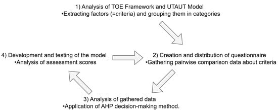 AHP was selected as the central decision-making method for this study because it has proven to be effective in addressing complex, multi-criteria decision problems and can systematically quantify the judgments of experts. This approach is particularly well-suited for modeling organizational readiness to adopt AI, where different factors—technological, organizational, environmental, and individual dimensions—need to be prioritized within a hierarchical structure. AHP facilitates the decomposition of the decision problem, supports the consistency check of expert contributions, and enables the aggregation of multiple expert judgments into a coherent group decision. The application of AHP has been proven in previous research on technology adoption, digital transformation, and strategic planning in the public sector, which underlines its suitability for this context. For example, it has been used to evaluate the quality of AI-generated digital educational resources using the combined Delphi method and AHP [32], to prioritize corruption-prone stages in public procurement for blockchain integration [33], and to identify critical success factors for BIM implementation [34]. Furthermore, studies such as ceramic antenna manufacturing [35] demonstrate the use of AHP within the TOE framework, similar to the hybrid approach adopted in our study. Another study, such as chatbot adoption intention in the public sector [36], highlights a real-world gap where user-level perspectives could be added. Building on this established methodology, our study contributes to a novel application of AHP to assess the organizational readiness to adopt AI in the public sector while integrating the TOE and UTAUT frameworks to capture both systemic and individual determinants. Integrating both TOE and UTAUT frameworks is a viable methodology for assessing different technological, organizational, environmental, and individual factors influencing the adoption of a new technology [37,38].