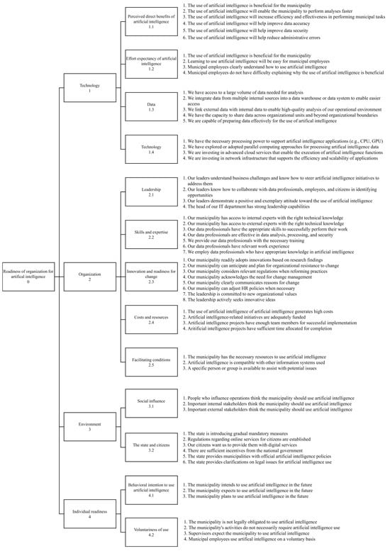The proposed decision model for assessing organizational readiness for AI was developed as a hierarchical, tree-like structure that embeds thirteen criteria into four categories—namely, technology, organization, environment, and individual readiness. The proposed decision model comprises four categories: technology, organization, and environment, derived from the TOE framework, and individual readiness, derived from the UTAUT model. The TOE framework is well-suited for assessing external and organizational factors that influence technology adoption as it focuses on technological, organizational, and environmental factors. However, the TOE framework does not explicitly address individual-level factors that are critical to understanding user acceptance and readiness, especially in the public sector, where acceptance often depends on employee attitudes and behavior.