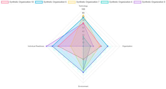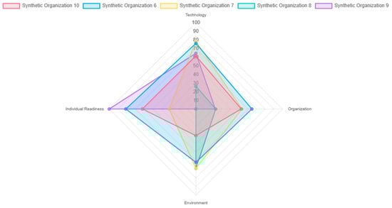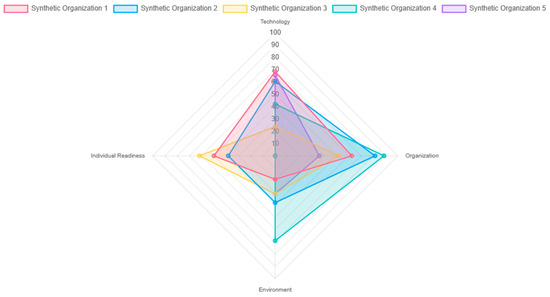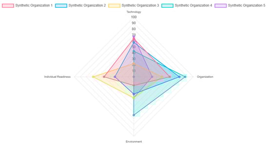 The resulting overall score is a normalized value between 0 and 1, which we express as a percentage (0–100%) for clarity and interpretability, as is common in AHP-based decision models. This percentage represents the relative proximity of the organization to full readiness for artificial intelligence adoption.