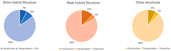 Comparing the carbon emissions from the production of building materials, transport and construction of building materials at different stages of the physicalisation of the housing structure (Figure 2), overall, the production of building materials contributes the largest share of carbon emissions in all three types of housing structures.