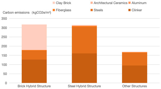Comparing the carbon emissions per unit area of different residential structures at the materialisation stage (e.g., Table 5), the carbon emissions per unit area of steel mix are the largest, followed by brick mix, while other structures (e.g., timber frame, kiln, etc.) emit less carbon, which is about 1/2 of the carbon emissions of steel mix.
