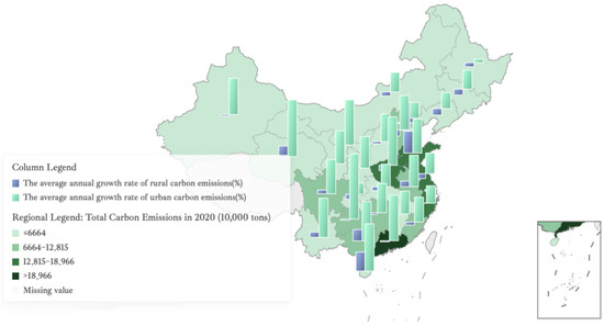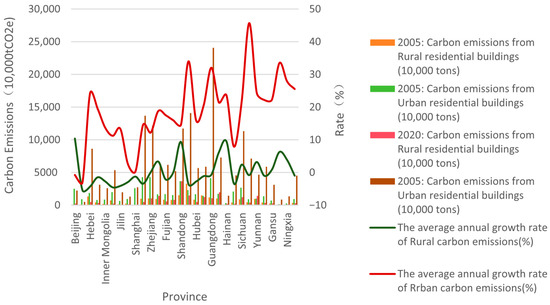 In order to compare the differences in carbon emissions at the stage of physicalisation of residential buildings in urban and rural areas in various provinces and cities, Figure 4 shows the implied carbon emissions and average annual growth rates of urban and rural residential buildings at the stage of physicalisation in 2005 and 2020 in various provinces and cities in China.
