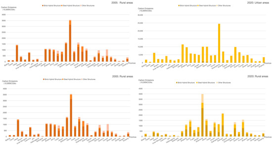 As can be seen from Figure 4, carbon emissions from urban residential construction in most provinces and cities show a rising trend, while rural residential construction shows a negative growth in most provinces and cities, which may be related to the increasing rate of urbanisation and the continuous development of the economy and technology, the increase in the urban population, and the rapid expansion of the scale of housing. From the value of carbon emissions, whether in 2005 or 2020, it is evident that urban carbon emissions are much greater than rural carbon emissions: on the one hand, this is related to the residential building area constructed in that year, and in most provinces and cities and the whole country, comparing urban to rural areas in that year, the scale of residential construction is larger, and the area of constructed residential buildings is larger. On the other hand, although the structure of rural dwellings has changed somewhat with the development of time, other structures (e.g., wood, bamboo, grass structures, kilns, etc.) still account for 20–30 per cent of residential construction in rural areas at the national level, and their carbon emissions are relatively low, while the proportion of other structures in cities and towns has remained below 3 per cent for a long time.