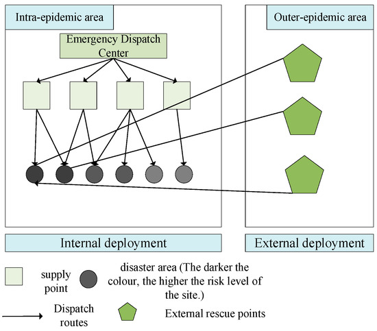 Public health emergencies such as epidemics are characterized by contagiousness and diffusivity. After the outbreak of an epidemic, it will quickly spread to the surrounding area, forming a more serious internal area and a less serious external area. Compared with the external region, the degree of the epidemic in the internal region is more serious and the emergency supplies are also more limited, so the internal region emergency supplies are in high shortage. Therefore, the external region of the epidemic can be organized to carry out emergency supply rescue to the internal region of the epidemic to make up for the shortage of emergency supplies in the internal region of the epidemic. The disaster sites in the internal region of the epidemic, the demand for emergency supplies, and the degree of urgency will show differences in the limited time available due to the severity of the epidemic, the number of people, economic conditions, etc. How to scientifically allocate limited emergency materials in such limited time according to different disaster situations plays an important role in improving the effectiveness and precision of the rescue work. At the same time, the contagiousness of the epidemic makes it difficult to predict the number of people affected by the disaster and the amount of material demand, and it is necessary to introduce the theory of infectious disease dynamics for research. Zhu et al. [15] proposed a multi-objective fuzzy optimization model based on IT2TFS, aiming to optimize material delivery time, transportation frequency, and inventory cost, thereby enhancing the efficiency of disaster relief supplies. Ding et al. [16] designed a multi-objective emergency material scheduling method based on gray interval numbers, which improves the efficiency of disaster response by optimizing objectives such as time cost, transportation, and production cost. Guo et al. [17] designed a multi-objective shortest path problem for multi-mode transportation in emergency logistics, aiming to optimize transportation time, distance, and cost. Xu et al. [18] constructed a multi-mode path optimization model for emergency material transportation, aiming to minimize transportation time and cost. By introducing a risk coefficient, uncertain parameters are converted into deterministic values, further optimizing transportation paths and scheduling, and improving the emergency response efficiency of the logistics system. Ye et al. [19] proposed a multi-objective optimization emergency response framework integrating pre-disaster and post-disaster stages. The pre-disaster stage aims to minimize cost; in the post-disaster stage, third-party emergency forces are introduced to optimize material scheduling schemes with the objective of simultaneously minimizing transportation cost and rescue time. Hu et al. [20] proposed a multi-objective robust optimization model for designing optimization schemes in epidemic emergency logistics, thereby minimizing transportation time, transportation cost, and material shortage, improving emergency response efficiency and reducing costs. Wang et al. [21] constructed a multi-period emergency material distribution optimization model, using the NSGA-II algorithm to optimize material allocation. The objectives of the model include improving time-perceived satisfaction in disaster areas, reducing the pain effect of material loss, and lowering overall rescue cost. Liu et al. [22] analyzed the complex adaptive characteristics of cross-regional emergency collaboration in China through stochastic evolutionary game theory, constructing two game models: regional integration and paired assistance. The research showed that intergovernmental collaboration efficiency, emergency fund reserves, and external support have a significant impact on the stability and effectiveness of emergency collaboration. Therefore, in the epidemic disaster situation, we need reasonable classification of the epidemic population, scientific prediction of the epidemic material demand and classification of the risk level of each disaster point according to the disaster information of the internal region of each disaster point. After determining the degree of urgency of the demand, we implement a differentiated emergency material dispatch strategy to efficiently deploy the resources in the internal and external region of the epidemic. The key issue of this paper is to achieve the best prevention and control of the epidemic. The network of emergency material dispatching is shown in Figure 1.