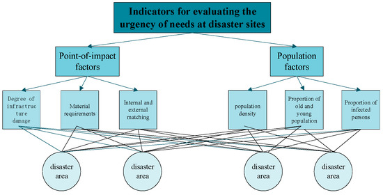 In this paper, the urgency degree of demand is taken into account in the distribution of supplies to ensure that the supplies at demand points with a higher degree of urgency of demand are met with higher priority. As shown in Figure 3, the degree of internal and external dispatching, regional population density, proportion of injured and stranded people, proportion of old and young people, demand for emergency supplies, and the degree of damage to infrastructure are selected as the evaluation indicators of the degree of urgency of the demand for emergency supplies at the disaster site.