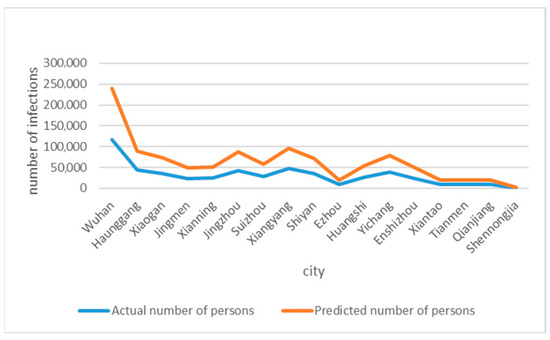 By using the SEIR model to predict the number of infected people in various cities in Hubei Province, we obtain the fitted prediction data of the epidemic (as shown in Table 1). By comparing this with the real-world data, we obtain the following Figure 4, which shows that the forecasting results are good.
