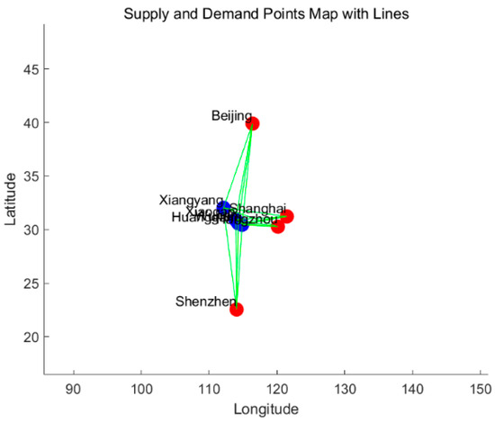 Through the calculation of this scenario to achieve the emergency supply dispatching program, the objective functions are as follows: f1 is 74.2 h; f2 = CNY 385,743.9. The internal dispatching program is shown in Table 12 and in Figure 5. The external dispatching program is displayed in Figure 6. Based on actual logistics and vehicle deployment statistics from Hubei Province’s pandemic response, the daily vehicle utilization rate is 85–92%, and in accordance with the “COVID-19 Emergency Logistics Vehicle Allocation Guidelines” issued by China’s Ministry of Transport, our model incorporates specific operational metrics: an average vehicle capacity of 8–12 t, daily operating ranges of 200–300 km, and typical fleet sizes of 15–30 homogeneous vehicles per distribution center. All of these values reflect the real-world emergency logistics operations during the crisis.