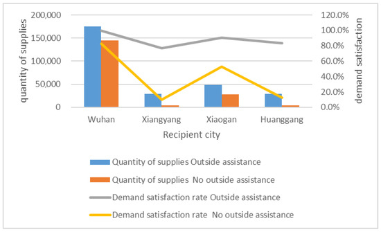 In order to verify the effectiveness of the model, this paper compares the difference in emergency material dispatching effect with and without considering external rescue (Table 14) and draws a comparison between the quantity of materials and demand satisfaction before and after obtaining external rescue (Figure 7). It shows that the material demand satisfaction of the cities at the affected points rises significantly after considering external rescue, which makes up for the shortcomings of the internal emergency material dispatching. It reflects the scientific rationality of including external rescue.