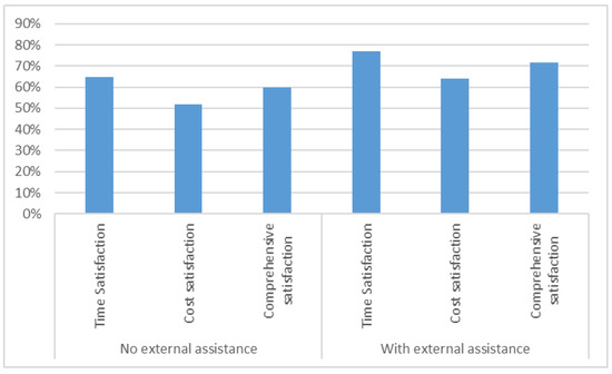 In this paper, we also set a comprehensive satisfaction function to verify the difference in comprehensive satisfaction with and without external rescue in Figure 8. It can be seen that since external rescue increases the time and cost of rescue, both time satisfaction and cost satisfaction increase. It also leads to an increase in comprehensive satisfaction, which is in line with the actual situation of emergency material dispatch and rescue.