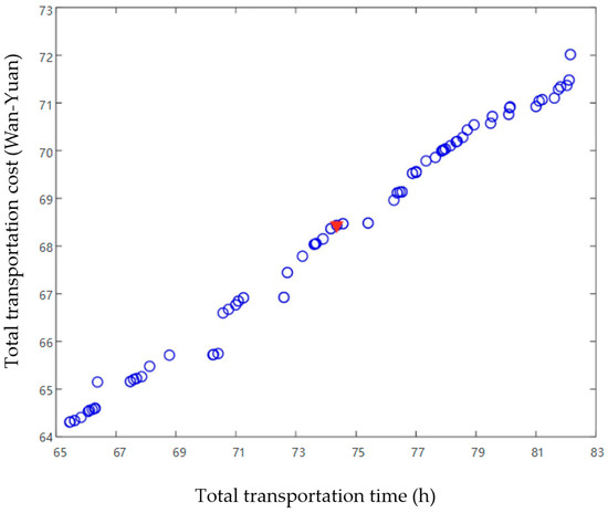 According to the above case information, the genetic algorithm is used to solve the model in Matlab R2021a. The relevant parameters of the NSGA-II algorithm are as follows: population size = 100; the maximum number of iterations (maxgen) = 300; chromosome crossover rate = 0.8; mutation rate = 0.01; the objective function weights are set to w1 = 0.7 and w2 = 0.3. The vehicle drives at a uniform speed during the vehicle dispatch and the transport speed is 50 km/h. The material penalty cost is 10 CNY/unit and transport cost is 5 CNY/km. A vehicle can be loaded with 2000 units of goods.
