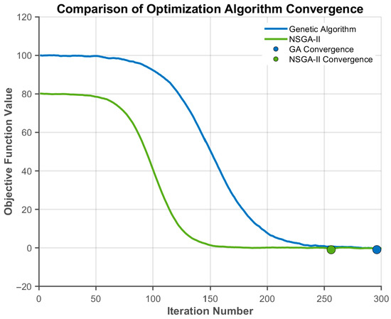 In order to verify the effectiveness of the algorithm, the two objectives of this paper are transformed into a single objective, solved by the GA algorithm, and then compared with NSGA-II. The parameters of the GA algorithm and the data settings of the algorithm are kept the same as those of NSGA-II, and the iterative curves of the two algorithms are obtained. The iterative curves of the GA and NSGA-II algorithms are shown in Figure 9 and Figure 10. It is seen that the NSGA-II algorithm is better than the GA algorithm.