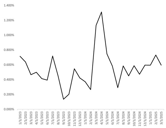 Figure 1. Monthly noncompliance rate of food sampling in Shanghai from 2023 to 2025 (Q1).