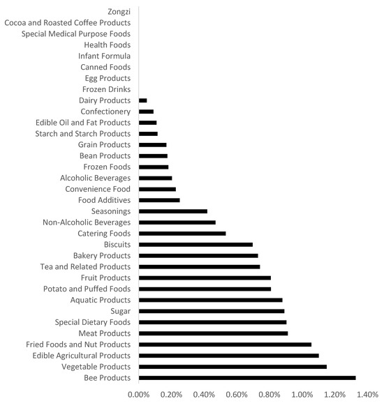 - Category Distribution of Food Risks. Through in-depth analysis of 34 food categories in Shanghai, three high-risk categories were identified: (1) Three significant high-risk categories. First, honey products (1.327%) exhibited the highest risk level, with pesticide residue exceedance as the main issue (accounting for 67.3% of nonconforming samples), peaking in the second quarter. This aligns with the peak period of pesticide application in nectar plants, indicating direct contamination from raw honey sources and reflecting weak source control. Second, vegetable products (1.150%) faced dominant risks from additive misuse, such as benzoic acid excess, particularly in pickled subcategories. This corresponded to the surge in winter pickled food consumption during the fourth quarter. Third, agricultural products (1.102%) were vulnerable to microbial contamination and pesticide residue exceedance. Their summer noncompliance rate was over twice that of winter, highlighting temperature-dependent risks and exposed source control gaps. (2) Medium-to-low-risk categories exhibited significant heterogeneity in noncompliance characteristics. For instance, roasted nut products were primarily affected by aflatoxin and acid value exceedance, while meat products showed risks from peroxide value and nitrite excess, largely due to substandard storage conditions. Infant formula and other categories achieved zero noncompliance throughout the study period, demonstrating regulatory emphasis on these products and underscoring the importance of full-chain production control. (3) Category risks exhibited seasonal migration. In the first, second, third, and fourth quarters, the most prominent risky categories were meat products, honey products, aquatic products, and vegetable products, respectively. Special dietary foods and roasted nuts showed annual rising noncompliance trends, while dairy products exhibited a decline. Food category sampling results revealed significant category heterogeneity and temporal dynamics. Therefore, a dual-track governance mechanism combining “risk-stratification-based category-specific precision control” and “seasonal fluctuation-adaptive temporal prevention” is required to address core issues: honey product pesticide residues, additive misuse in vegetable products, and pesticide residue in agricultural products. Enhancing source control and process intervention synergies will improve food safety governance efficiency. Category-specific noncompliance rate changes are illustrated in Figure 2.