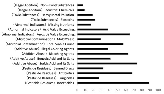 - Cause Distribution of Food Risks. Food safety risks are categorized into six primary contamination types: pesticide and veterinary drug residues, additive misuse, microbial contamination, indicator anomalies, toxic substances, and illegal additives. This study further classifies these into 17 subcategories (see Figure 3). Among them, pesticide and veterinary drug residues are the most severe issues, dominated by chlorpyrifos and thiamethoxam, concentrated in agricultural products, with the highest detection rate in summer. Second is additive misuse, primarily benzoic acid—a key ingredient in pickled vegetables. Excessive sulfur dioxide in starch products also warrants attention. Third is microbial contamination, mainly colony count exceedance and mold pollution, often linked to cold chain infrastructure and hygiene conditions. Contamination causes exhibit category specificity: pesticide/veterinary drug residues and illegal additives predominantly occur in agricultural products; peroxide value, sulfur dioxide, and microbial overruns mainly affect processed foods like meat products, pastries, and vegetable products. In summary, contamination issues display a “three-dimensional pattern”: pesticide/veterinary drug residues as the primary driver, additive misuse as secondary, and microbial contamination fluctuating with temperature. A three-track strategy is required to block risks across the farm-to-table chain: source control of pesticides/veterinary drugs, process upgrades for additives, and cold chain reinforcement against microbial threats.