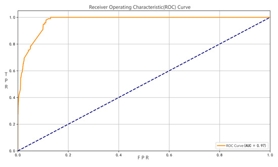 This study systematically evaluated the performance of the XGBoost classifier using the Receiver Operating Characteristic (ROC) curve, as shown in Figure 4. The results demonstrate superior discrimination capability between compliant and noncompliant food samples. First, the Area Under the Curve (AUC) reached 0.97, significantly exceeding the random guessing baseline(The dashed line in the ROC curve represents the random reference line). This indicates the model’s exceptional ability to distinguish between compliant and noncompliant samples, positioning it among the top-tier machine learning classifiers. Second, within the False Positive Rate (FPR) range below 0.1, the True Positive Rate (TPR) rapidly increased to over 0.99, forming a steep ascending curve. This suggests the model can nearly perfectly capture all noncompliant products, markedly outperforming traditional detection methods. Finally, when FPR exceeded 0.1, the curve plateaued, signaling that the model’s recognition capacity for positive instances had reached its performance ceiling. Further reduction in the classification threshold yielded minimal improvement in recall. These findings validate that the XGBoost model, through ensemble learning, effectively captures complex nonlinear relationships between features and noncompliance risks, providing a technical foundation for building a precise food safety early-warning system.