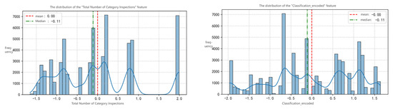 Figure 6 shows the distribution of” Monthly Total Inspections for the Category” after Z-Score normalization(The smooth curve denotes the Kernel Density Estimation (KDE), which illustrates the continuous probability distribution of the data to complement the discrete histogram and reveal features like peaks or skewness). The feature has a mean close to 0 and a median of −0.11, indicating most businesses’ inspection frequencies are around the average. However, there is a significant right skew, with a few businesses having much higher inspection frequencies (e.g., peak in the 1.5–2.0 range). This aligns with the business logic that high-risk categories need more frequent regulation and shows that the feature engineering retained the differences in regulatory intensity.