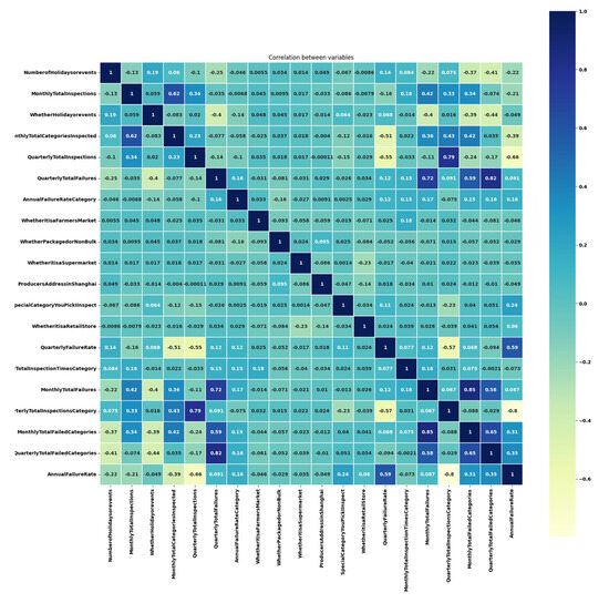 - Feature Correlation Analysis. As shown in Figure 7, the feature correlation matrix based on Pearson’s r supports the above results. Specifically, the strong positive correlation (r ≈ 0.89) between monthly and quarterly retail chain inspections reflects the temporal nesting of regulatory frequency. The correlation (r = 0.62) between the number of holidays and supermarket inspection frequency aligns with the logic of allocating regulatory resources to consumption peaks. Strong correlations (e.g., more inspections in a quarter leading to more inspected categories, or higher quarterly failure rates corresponding to higher annual rates) remain logically sound and help interpret the model’s predictions.