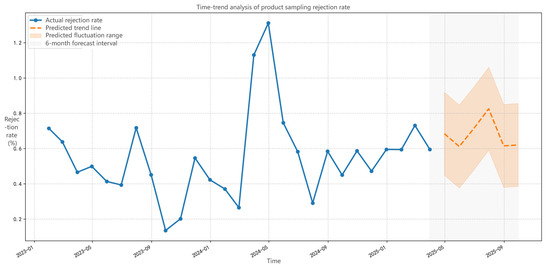 Model prediction results core findings mainly two: (1) Significant upward trend in noncompliance rates: In 2025, product inspection noncompliance rate will continuously rise from 0.52% in January to 0.81% in September (95% CI: 0.74–0.88%). This trend reflects globalization and fragmentation of supply chains, combined with the expansion of short-shelf-life product demand at the consumer end, causing systematic amplification of production process control errors. (2) Increased uncertainty: Prediction confidence interval (light orange band) width expands from ±0.02% in January to ±0.07% in September, revealing the need to focus more on severe consequences caused by extreme climate, regulatory blind spots, and insufficient process standardization.