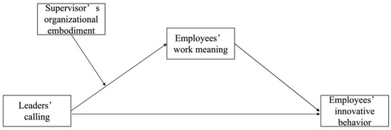 Amabile and Pratt [9] pointed out that the generation of individual creative ideas depends mainly on intrinsic factors (such as intrinsic motivation). Extrinsic factors (such as working environment) affect intrinsic factors, thus affecting individual innovation processes. Therefore, extrinsic factors (leaders’ calling) have an impact on employees’ intrinsic motivation (work meaning), thus influencing their innovative behavior. Leaders awaken employees’ work meaning through the strategies they formulate, policies they establish, and values they communicate with, and then stimulate employees’ work meaning to promote innovative behavior [58]. This means that leaders with a calling may have a positive effect on employees’ innovative behavior by stimulating their sense of work. Based on this, we hypothesize the following: