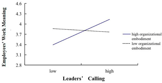 We suggest that supervisors’ organizational embodiment may also moderate the relationship between leaders’ sense of mission and employees’ work meaning. First, to some extent, a supervisor’s organizational embodiment implies the power, status, and influence of leaders in an organization. At the same time, subordinates perceive that leaders, who are regarded as the embodiment of the organization, often have more resources at their disposal for the organization [24,62]. When leaders have a high sense of calling, they tend to use these powers and resources to better guide employees to attach importance to the value and significance of work [63], thus enhancing their work meaning. In contrast, when the supervisor’s organizational embodiment is low, the leader has less organizational power and resources, which leads to the limited impact of his calling on employees’ work meaning. Second, the supervisor’s organizational embodiment conveys the message that the leader and organization exhibit consistent behavior. When a leader’s style or behavior is perceived as representing the organization to a large extent, it implies that the organization approves and encourages the leader. At this point, a supervisor’s organizational embodiment pushes employees to imitate and learn more from their leader [64]. Therefore, when employees perceive a higher level of organizational embodiment from the leader, they are more likely to interpret the leader’s behavior as advocated by the organization and accept the leader’s influence. In contrast, when the leader’s organizational embodiment is low, employees will think that the leader’s performance is not based on the expectations and requirements of the organization, resulting in a weak influence of the leader’s calling. Based on these two points, we hypothesize the following: