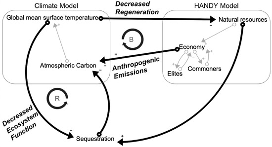 Contemporary society faces even greater challenges from environmental change than past collapsed societies [11]. Anthropogenic climate change can induce a reinforcing feedback that alters the potential for ecological systems to sequester carbon. These feedbacks can reinforce climate change through altered disturbance regimes, decreased ecosystem function, and decreases in carbon sequestration capacity [12,13,14,15]. Changing temperature associated with climate change has already led to phenological mismatches, range shifts, biodiversity loss, extinctions, and loss of crop photosynthetic capacity [13,16], all of which reduce carbon sequestration and access to ecosystem services. Declines in ecosystem services could drive societal derailment, i.e., disruption of social and economic systems and declines in human population, leading to reductions in anthropogenic GHG emissions through reductions in economic activity, in a balancing feedback that could reduce the rate of climate change [17].
