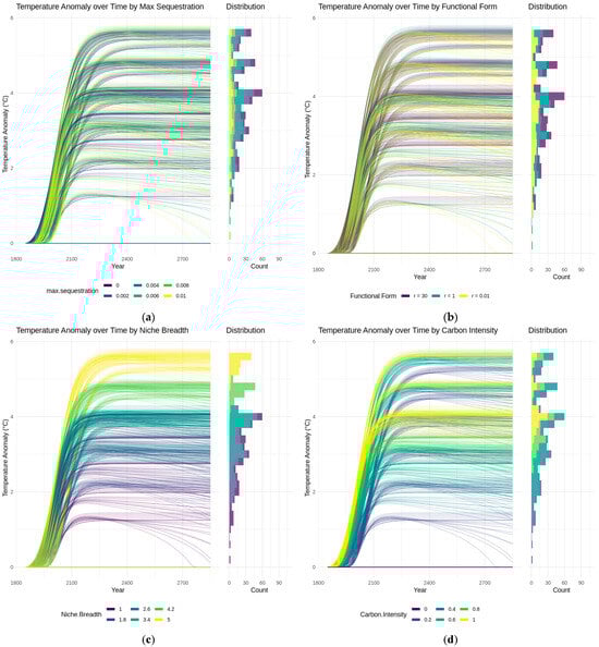 Effect of varied parameters on change in temperature over time. Varied parameters include (a) maximum sequestration, (b) functional form, (c) niche breadth, and (d) carbon intensity.