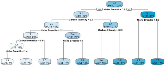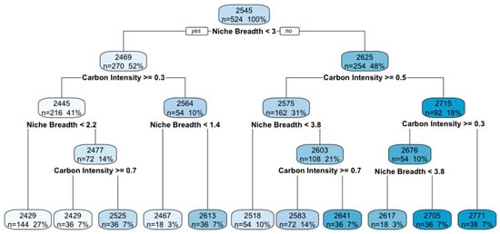 There was some clustering in both populations driven by a combination of carbon intensity and niche breadth (Figure A1 and Figure A2). We define collapse as a population with <1 person. Commoner populations that collapsed did so between years 2394 and 2850, with a mean collapse date of 2544 and a median of 2537 (Table A2). The mean collapse time with an IC of 0.2 was 2649, while a CI of 1 led to a mean collapse time of 2481. The mean collapse time with a niche breadth of 1 was 2430, while a niche breadth of 6 led to a mean collapse time of 2661. As niche breadth widened, both the number of years to collapse and the spread of possible times to collapse increased (Figure 4). Carbon intensity created stratification within this distribution of outcomes, with lower values of carbon intensity delaying collapse (Figure 4). A regression tree examining the time to collapse for commoner populations branched only on niche breadth and carbon intensity (Figure 5).