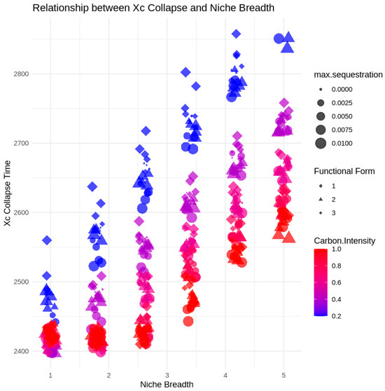 Determinants of year of commoner population collapse with niche breadth represented on the y axis, carbon intensity represented by color, maximum sequestration represented by size, and functional form represented by shape.