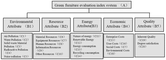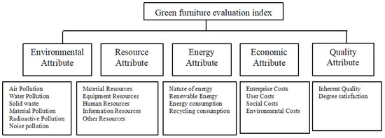 As a green product, the effect of green furniture meets the expected “green” requirements and environmental objectives, that is, from raw materials, production, sale (including packaging and transportation), use to disposal, and environmental and performance evaluation analysis of the entire lifecycle [34,35]. The evaluation of green furniture is a complex task involving multidisciplinary content and a great deal of process data. The greenness of furniture products often contains several aspects, such as environmental characteristics, resource characteristics, basic characteristics of the product itself, and energy characteristics of the product. Each has several evaluation elements. For example, the evaluation aspect of the basic characteristics of the product includes quality and functional indicators. Each evaluation factor has different evaluation factors, such as the quality factor, divided into the quality evaluation rate, safety, product sales rate, maintenance, structure disassembly, and other specific evaluation factors.