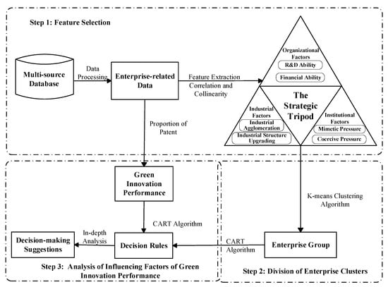Based on the strategic tripod framework, this paper uses machine learning algorithms to analyze the impacts of three-dimensional characteristic variables of organizations, industries, and institutions on the GIP of manufacturing enterprises. As shown in Figure 1, the research framework of this paper mainly includes the following three aspects: (1) feature selection of manufacturing enterprises (relevant data of listed manufacturing enterprises are obtained from multiple-source databases, and the three-dimensional characteristic variables of organizations, industries, and institutions are selected and measured based on the strategic tripod framework); (2) group division of manufacturing enterprises (following variable selection and measurement, correlation and collinearity analyses are conducted to ensure variable quality and independence. Subsequently, the K-means algorithm classifies enterprises into clusters, providing a basis for differentiated analysis); (3) analysis of the influencing factors of the manufacturing enterprises’ GIP. Based on the clustering results, the study further focused on the influencing factors of GIP. The organizational, industrial, and institutional variables were set as conditional attributes, and GIP was taken as the decision attribute. The CART algorithm was then used to mine the potential decision-making rules, aiming to deeply analyze the nonlinear relationship between the variables and the GIP in different enterprise groups.