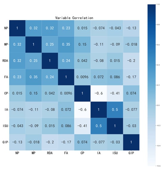 The Pearson correlation analysis results between variables (Figure 2) show that no significant high correlation exists between the seven initial variables and GIP. This indicates that GIP is not determined by a single factor but is the result of multiple factors. Consequently, an in-depth analysis of GIP’s influencing factors is required.