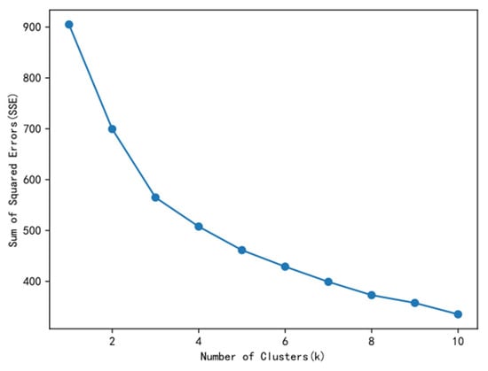 The implementation steps of this algorithm in this study are as follows: Firstly, the optimal number of clusters is determined by the elbow method combined with the contour coefficient. Then, k samples are randomly selected from the dataset as the initial clustering center, the similarity between all samples and each clustering center is calculated by using the Euclidean distance, and the samples are assigned to the closest cluster. Then, the average value of the samples in each new cluster is calculated as the new clustering center, and the clustering center is iteratively updated. When the allocation results of all samples no longer change, the algorithm terminates [].