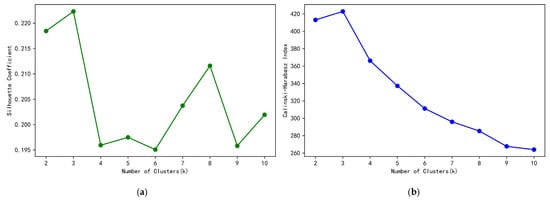 Plots of Silhouette coefficient and Calinski-Harabasz index. (a) Silhouette coefficient (b) Calinski-Harabasz index.