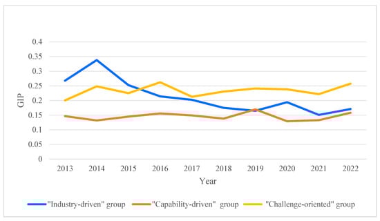 In addition, Figure 5 shows that from 2013 to 2015, the “industry-driven” group led in GIP, followed by the “challenge-oriented” and “capability-driven” groups. From 2015 onward, however, “challenge-oriented” group overtook and maintained leadership, with “industry-driven” group slipping to second and “capability-driven” group generally remaining third—despite occasional minor ranking shifts, the overall pattern held. The “industry-driven” group saw fluctuating declines in GIP. Given its weak R&D abilities and financial abilities, reliance on industrial environment advantages alone, without strong internal support, hindered long-term green innovation sustainability. In contrast, “capability-driven” group maintained stable, medium-low GIP with small fluctuations. While sufficient R&D investment and capital reserves provided a foundation, dual constraints from high coercive pressures and mimetic pressures, plus limited industrial conditions. The “challenge-oriented” group sustained medium-high GIP. High-intensity regulatory pressure offset weaknesses in enterprise capabilities and industry support, prompting gradual focus on key innovations and optimized resource allocation during passive adaptation—ultimately enabling late-stage overtaking and stable leadership.