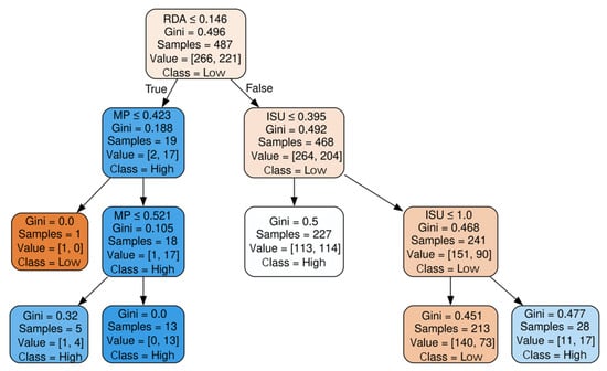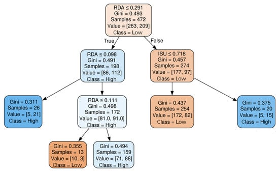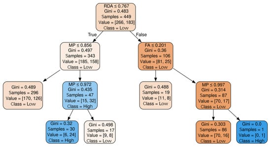 Decision trees are a machine learning method that can be used for classification and regression, and common algorithms include ID3, C4.5, and CART, all of which follow a top-down construction approach []. Compared with ID3 and C4.5, the CART algorithm performs better in terms of processing speed, computational workload, and other aspects []. In addition, the binary tree structure generated by this algorithm is hierarchical, making the results easy to interpret. During the tree construction process, it automatically conducts feature selection, which enables the identification of key influencing factors and the clarification of their mechanisms of action. Moreover, it excels at capturing complex nonlinear interactions, thus compensating for the limitations of traditional linear models in multivariate analysis []. Therefore, the CART algorithm has been widely applied in recent years [,,]. In fact, the algorithm mainly involves two processes: tree generation and pruning []. The tree is generated using a recursive dichotomy: starting from the root node, the Gini index of all features is calculated, the feature with the smallest Gini index is selected to segment, and the left and right subnodes are generated. Then, the above process is repeated for each subnode until the stop conditions are met. Pruning aims to solve the problem of overfitting the initial tree and is divided into pre-pruning and post-pruning: pre-pruning stops splitting by setting parameters such as the minimum number of samples, information gain threshold, and maximum tree depth. Post-pruning is generally based on support and confidence, starting from the lowest non-leaf node to remove the branches that contribute less to the performance of the model.